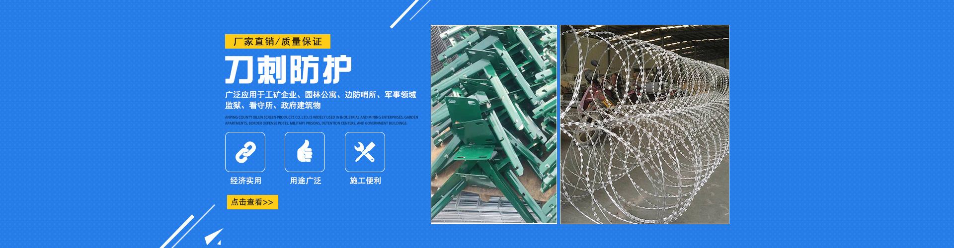 安平初日絲網(wǎng)有限公司是一家專業(yè)的絲網(wǎng)生產(chǎn)銷售廠家,主要產(chǎn)品有刀片刺繩、刺絲滾籠、刺繩支架等產(chǎn)品,公司為客戶提供產(chǎn)品知識和新鮮是市場行情,回答用戶產(chǎn)品相關(guān)問題,幫助用戶更好的選購產(chǎn)品。
